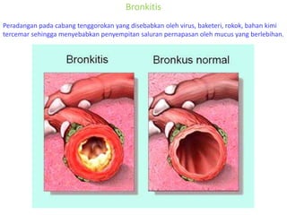 RPP ini memiliki tujuan untuk memudahkan peserta didik memahami gangguankelainan nama-nama penyakit yang berkaitan dengan sistem respirasi dan bisa. Kanker paru-paru disebabkan oleh menghirup produk Petroleum kromium asbes dan kebiasaan merokok. Dalam buku Herbal Penyembuh Gangguan Sistem Pernapasan karya Joko Suryo pneumonia adalah peradangan paru-paru yang disebabkan oleh infeksi bakteri jamur dan virus.